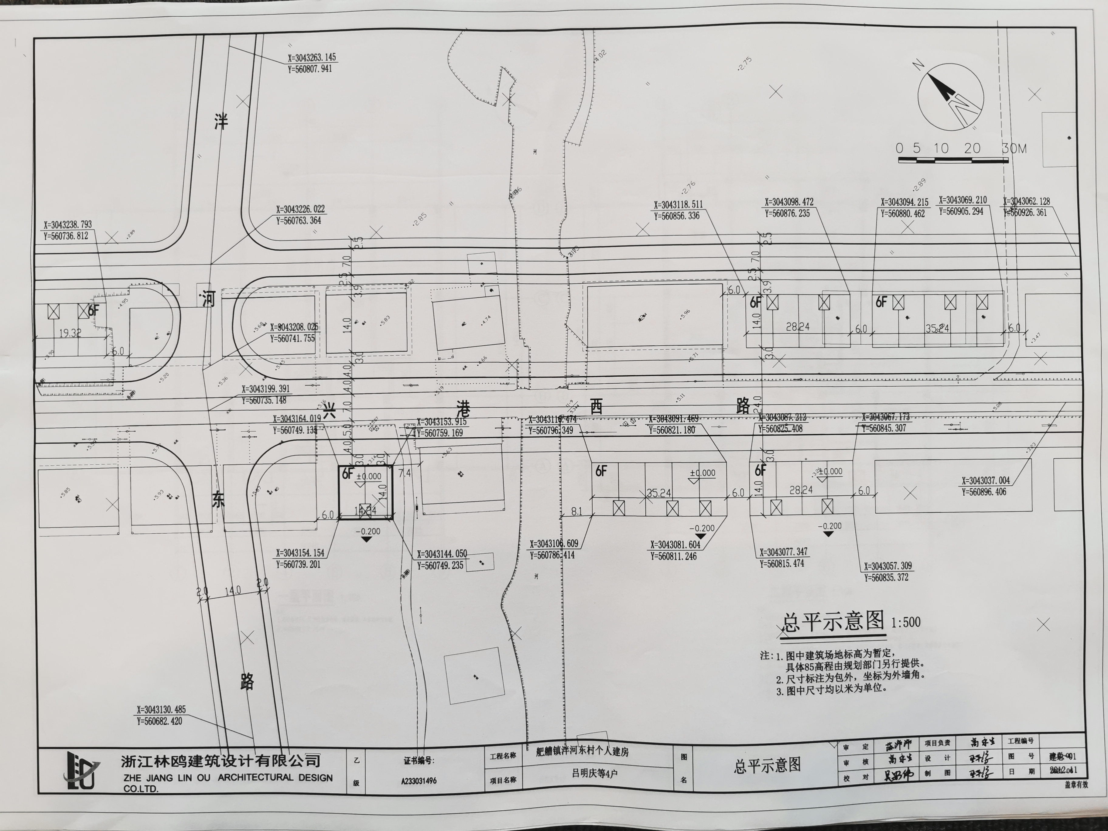 龙港市吕明庆等4户4间个人建房项目,土地坐落在龙港市巴曹龙巴公路泮河东路南侧地段,现进行建设工程规划许可批前公示,该项目作如下公示:(附总平面图、规划设计方案如图所示) (1)使用性质:公寓式住宅 (2)占地面积:199.36㎡ (3)建筑面积:1265.14㎡ (4)层数:6层 (5)其他经济技术指标见总平面图 凡是与本建设项目有日照采光、间距等重大利害关系公民、法人以及其他组织,应在公告之日起十日内,持本人身份证件以及证明利害关系存在的证据材料(如本人房屋所有权证、土地证等),向龙港市行政审批局反映情况,登记为利害关系人,依法行使陈述、申辩以及听证等权利。逾期不申报的,视为放弃上述权利。
